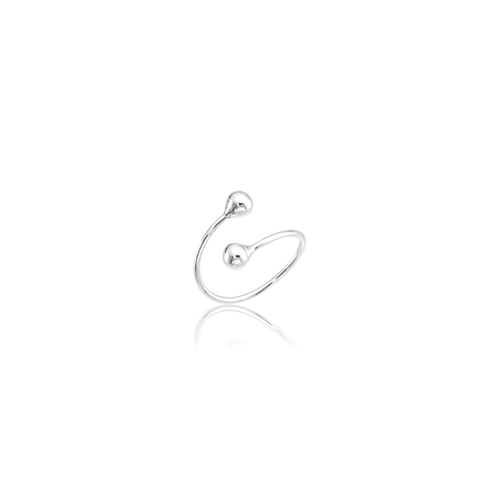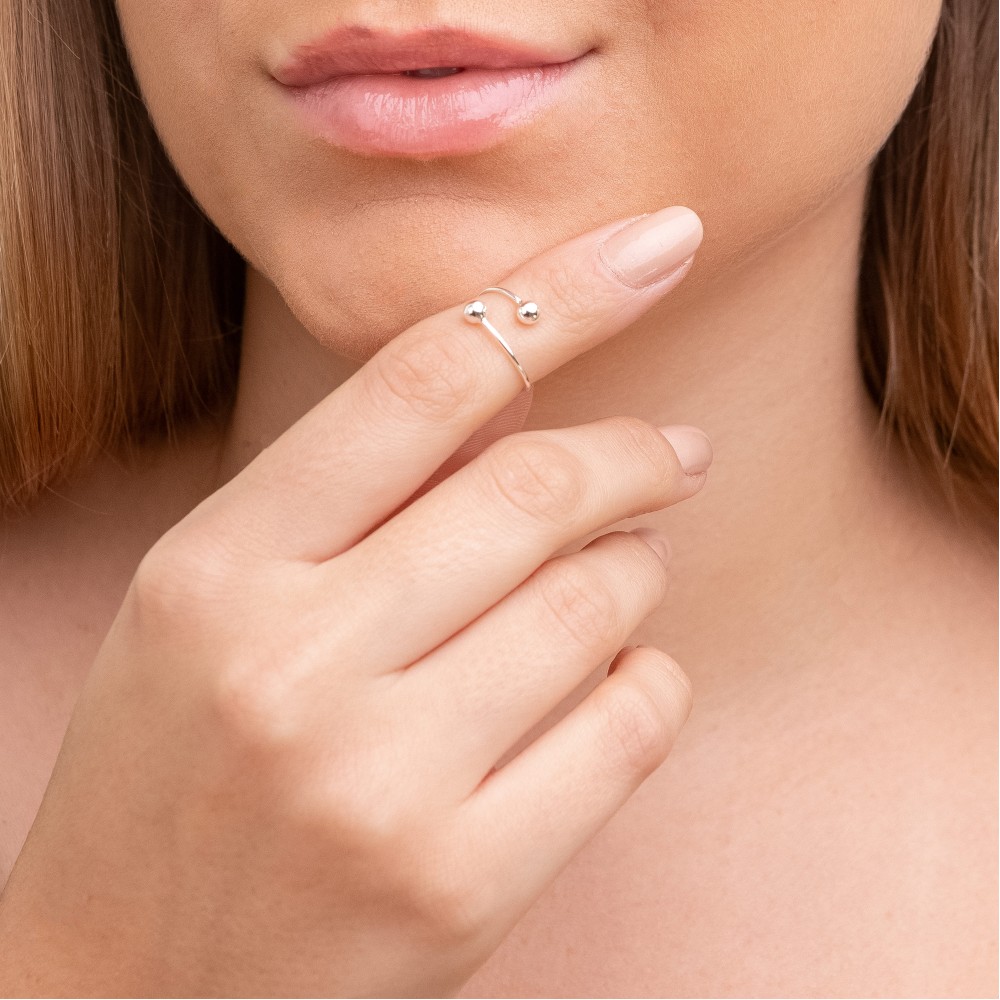 Fabricado em Prata 925 legítima, ele é ajustável, garantindo conforto e adaptação a diferentes tamanhos de dedo. O acabamento polido realça o brilho natural da prata, enquanto o detalhe das bolinhas nas pontas adiciona personalidade à peça, sem perder a delicadeza.