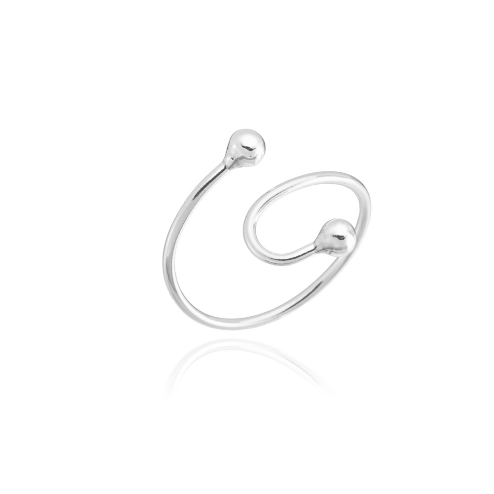 Fabricado em Prata 925 legítima, ele é ajustável, garantindo conforto e adaptação a diferentes tamanhos de dedo. O acabamento polido realça o brilho natural da prata, enquanto o detalhe das bolinhas nas pontas adiciona personalidade à peça, sem perder a delicadeza.